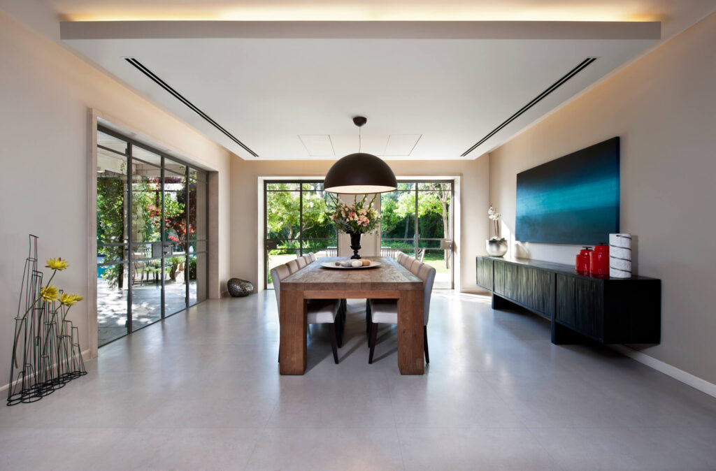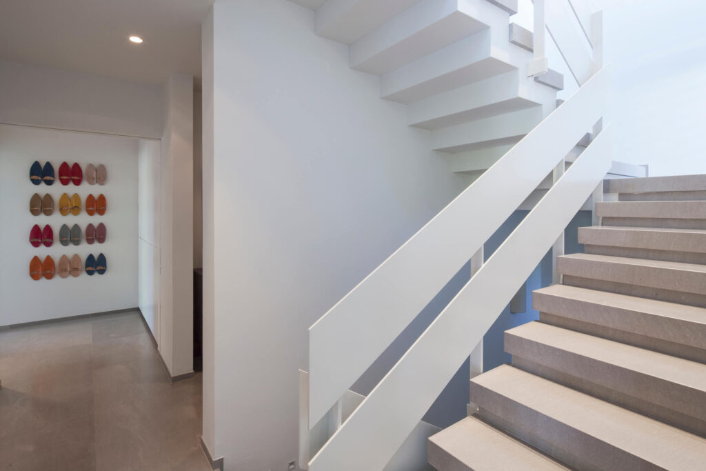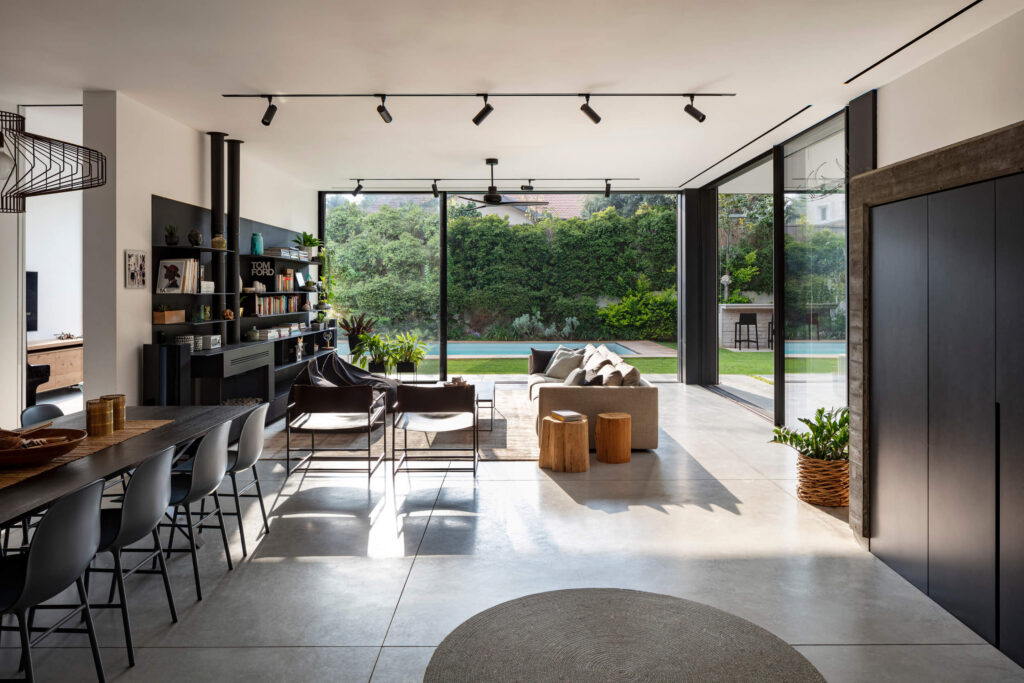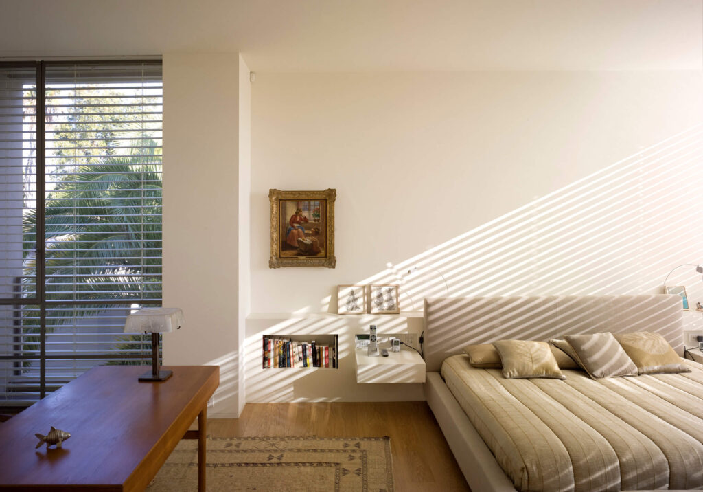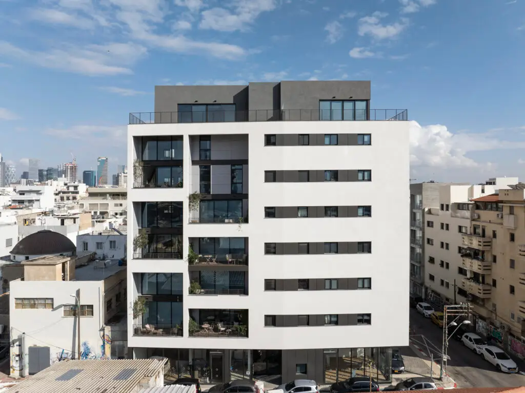 Four levels house that incorporate a plastered sloped roof with aluminum skin on the façade.