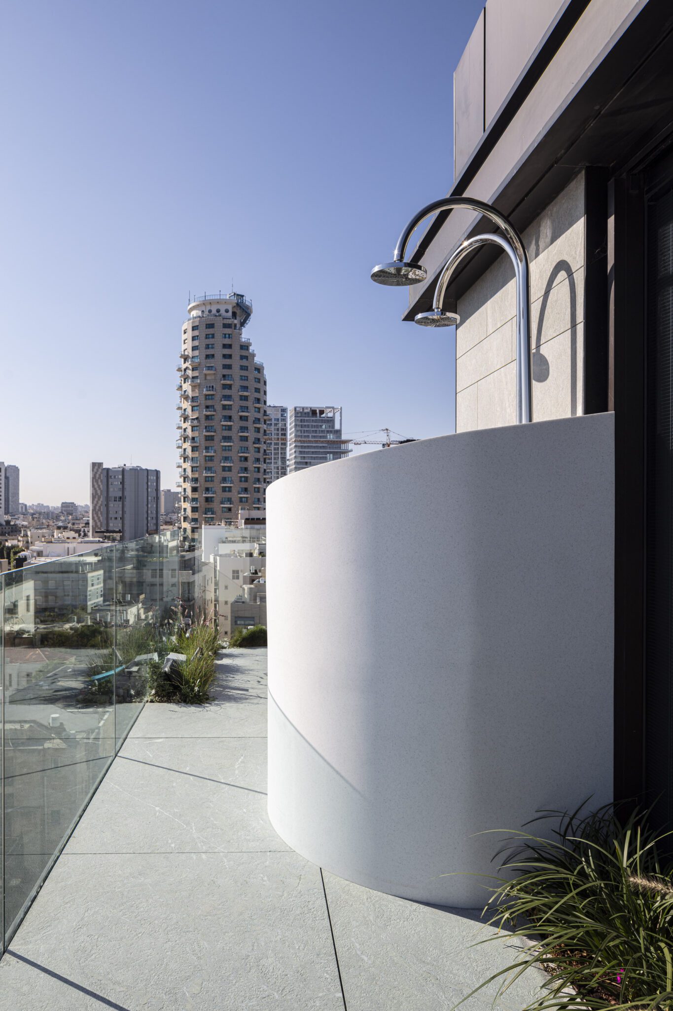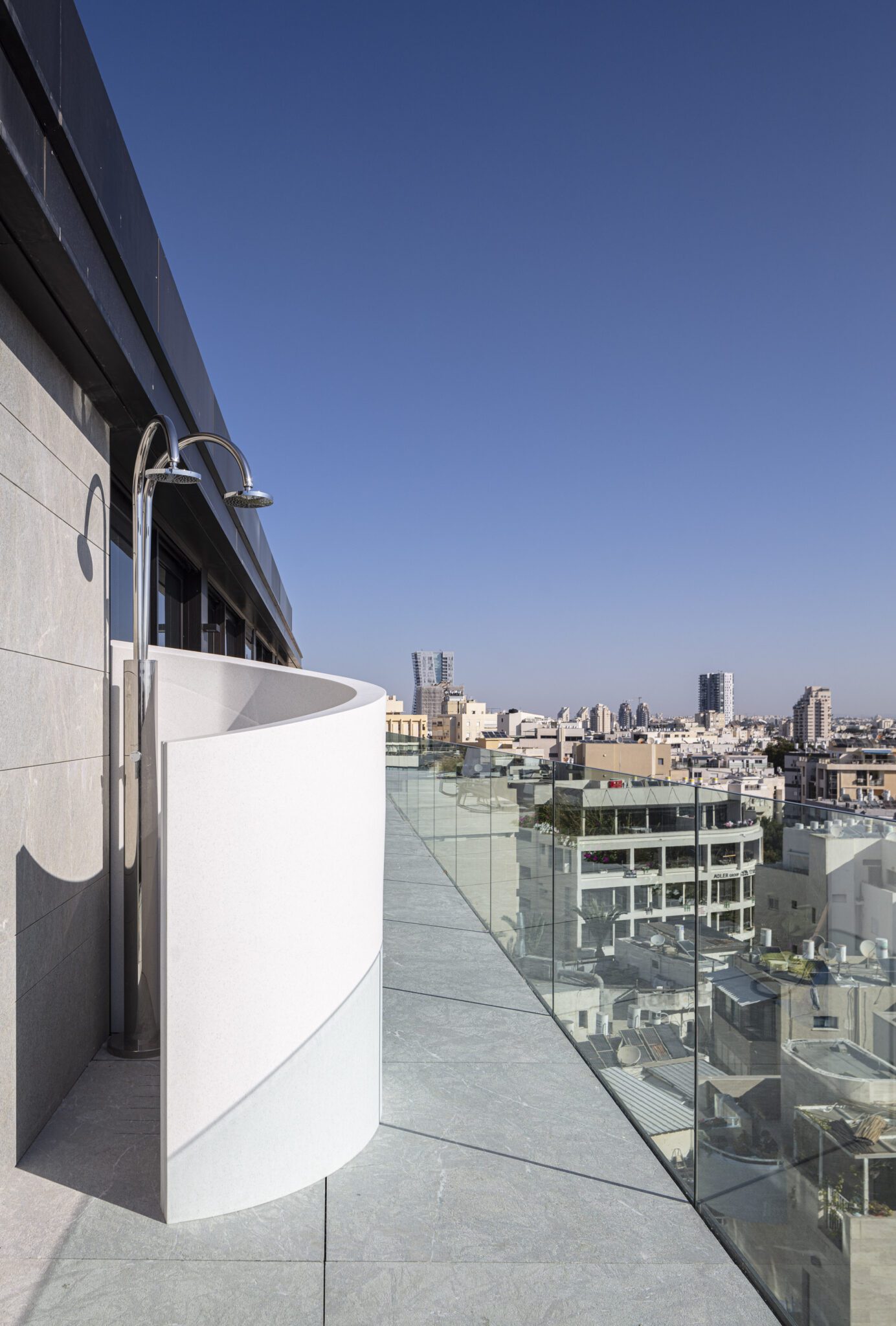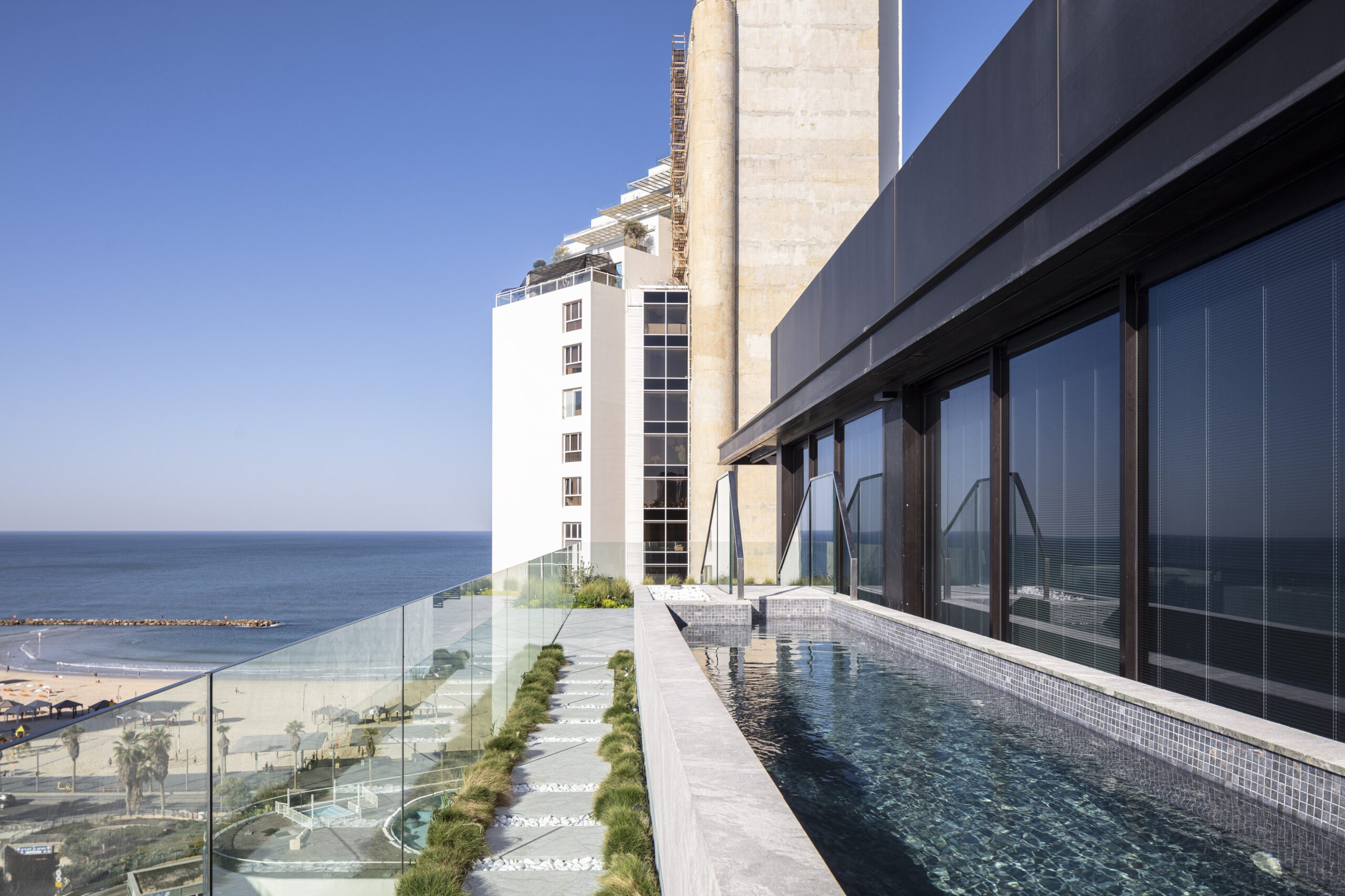 A duplex apartment with a roof and a pool in a luxury building next to the sea.