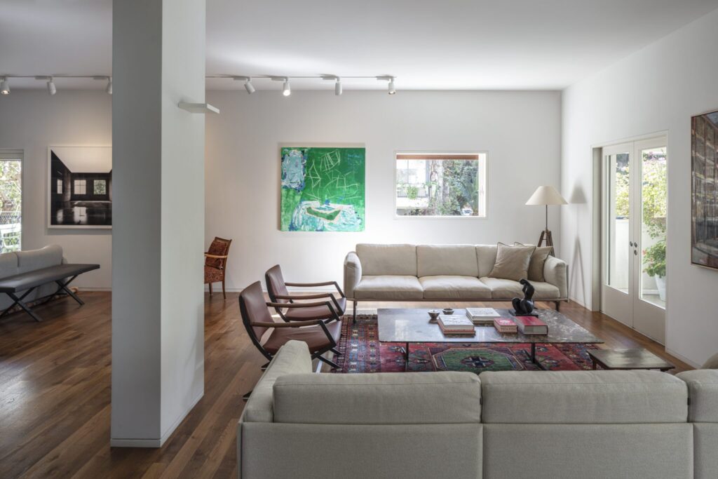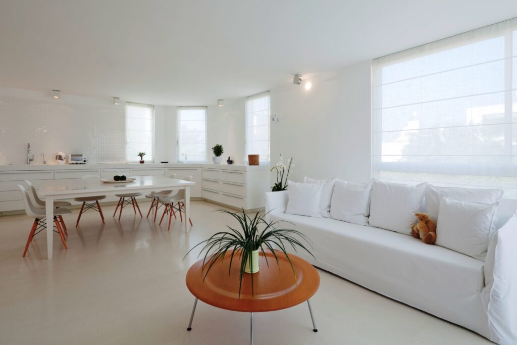 Exposed white concrete house constructed with OSB boards and fine detailing when the concrete meets the interior of the house.
