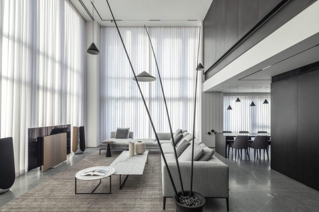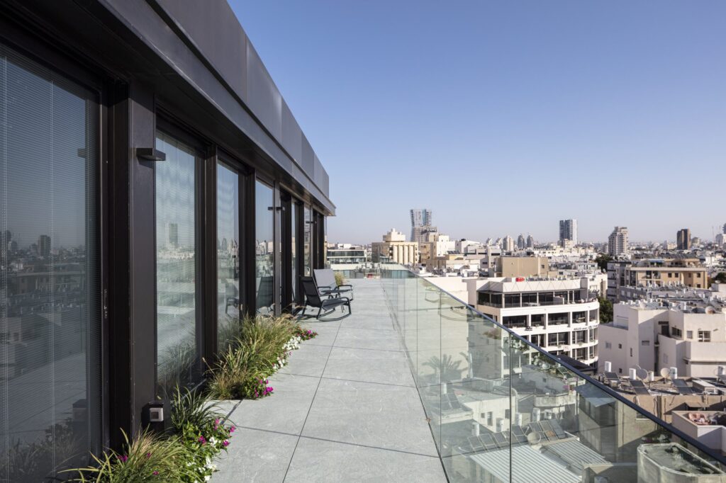 A duplex apartment with a roof and a pool in a luxury building next to the sea.