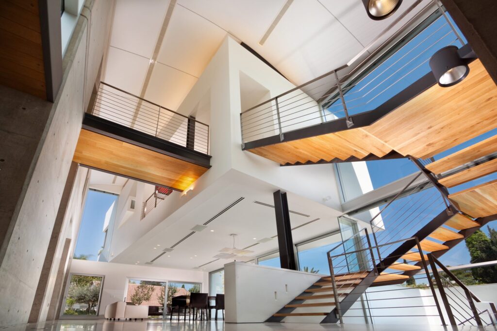 House with very wide openings that brings in the landscape, including special wooden beams with a very wide span.