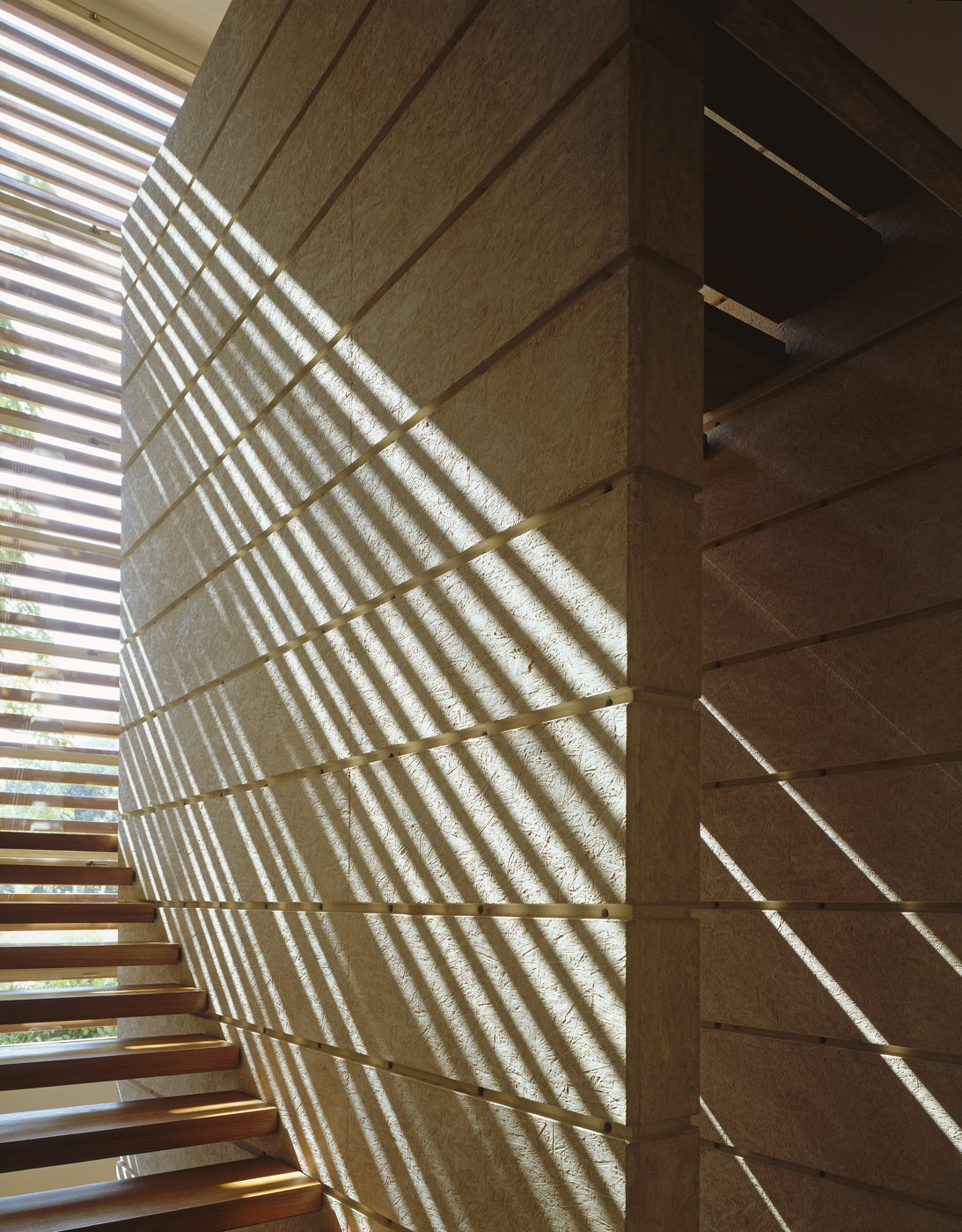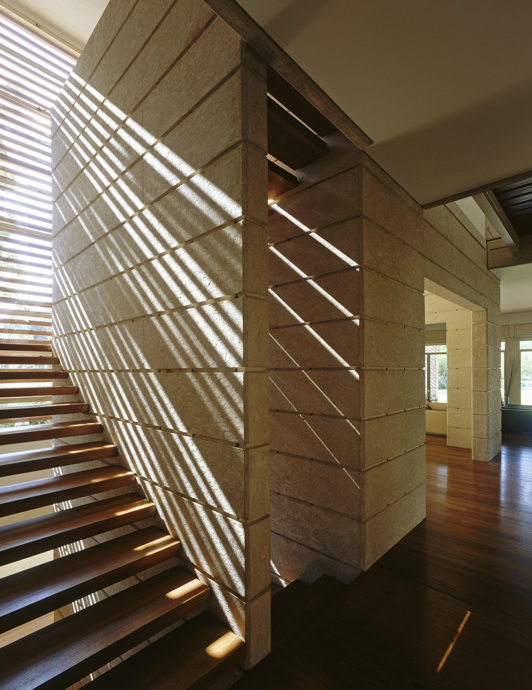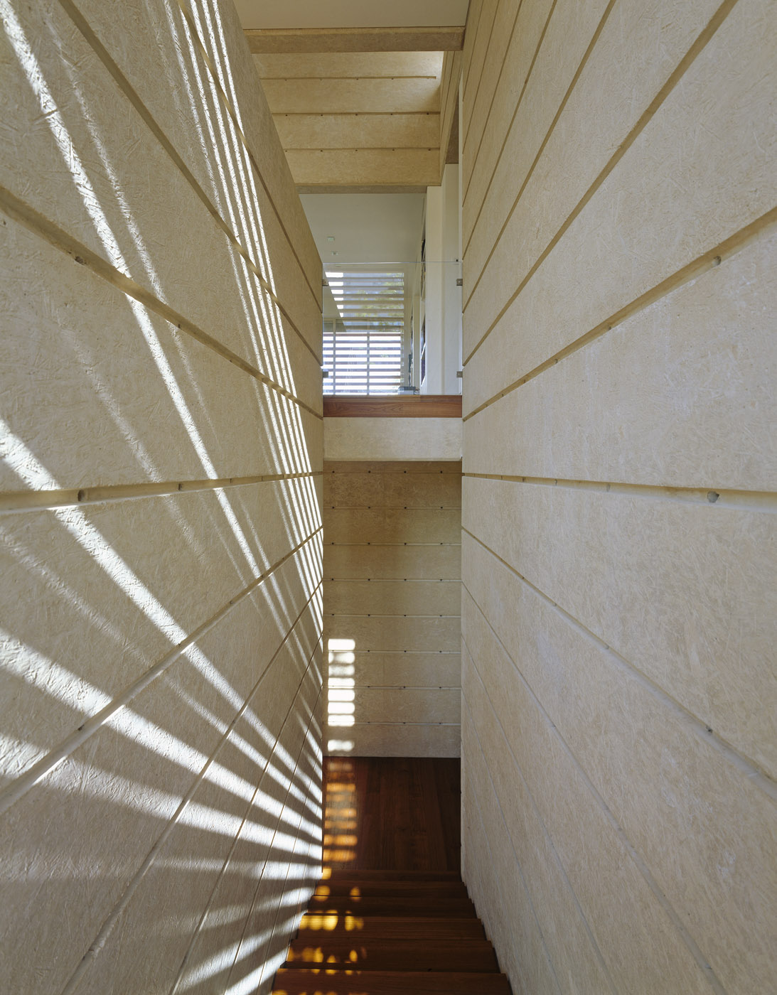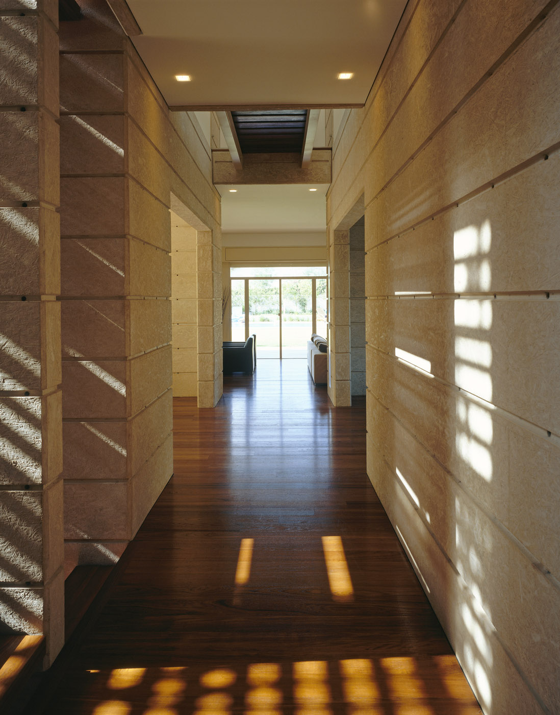 Exposed white concrete house constructed with OSB boards and fine detailing when the concrete meets the interior of the house.