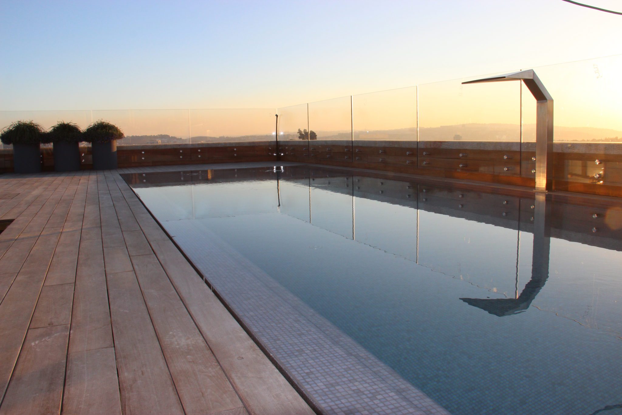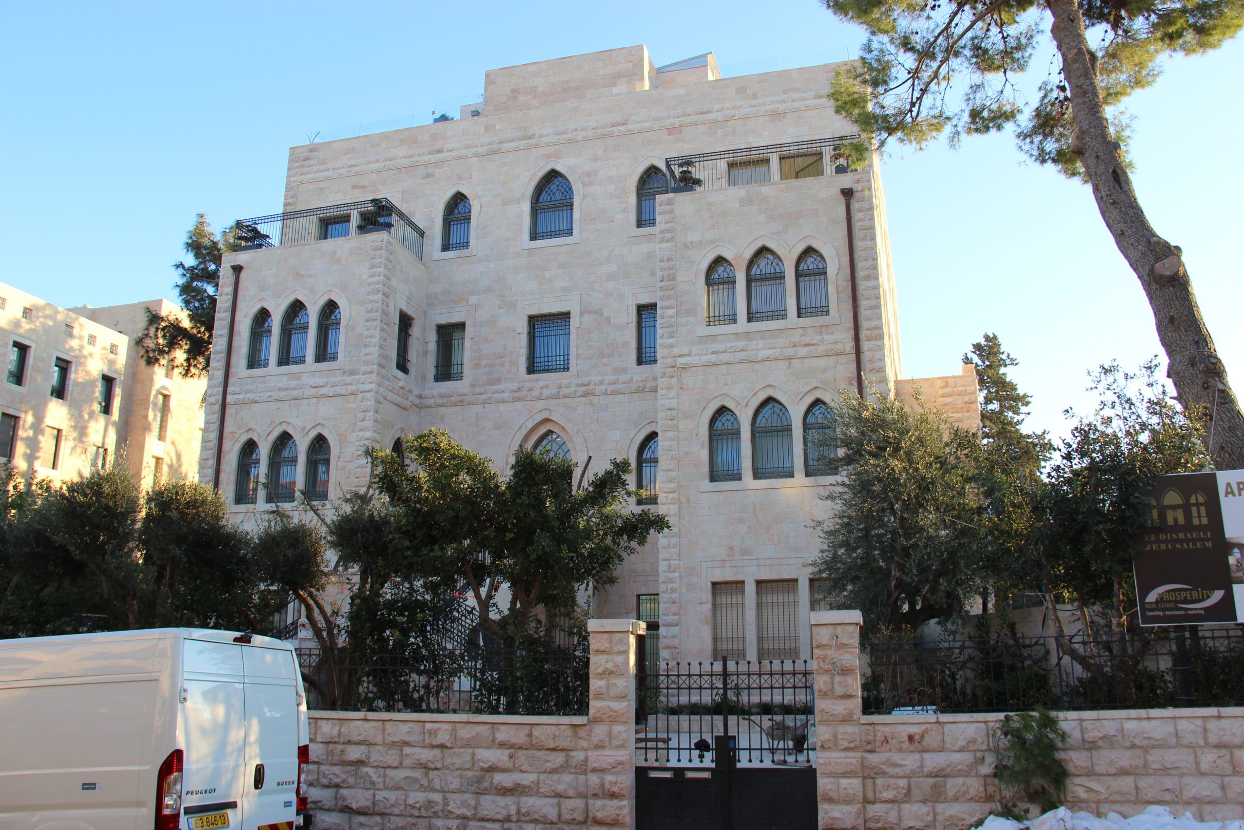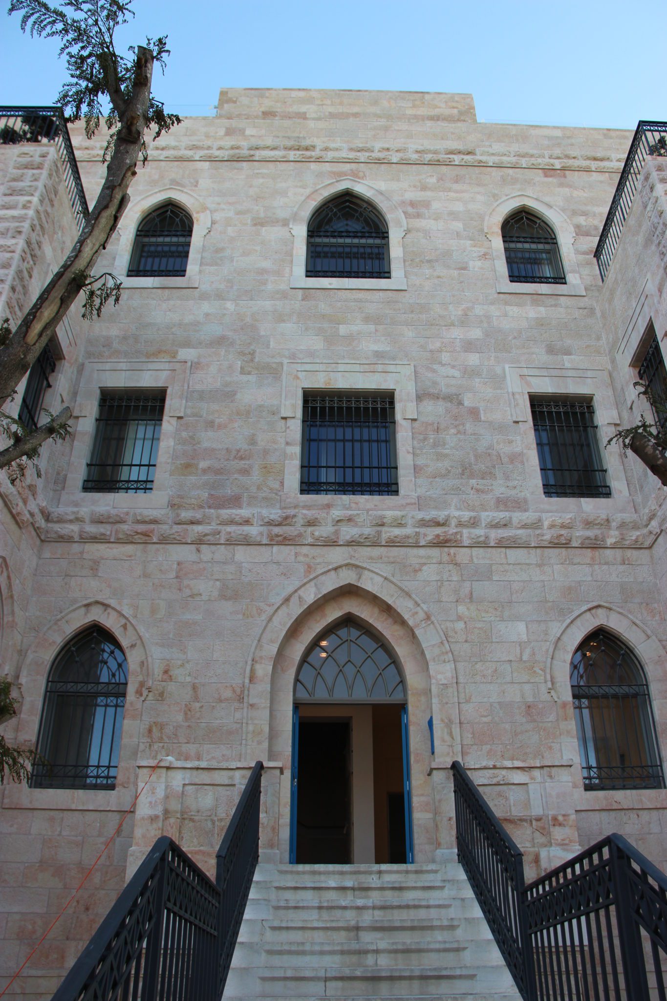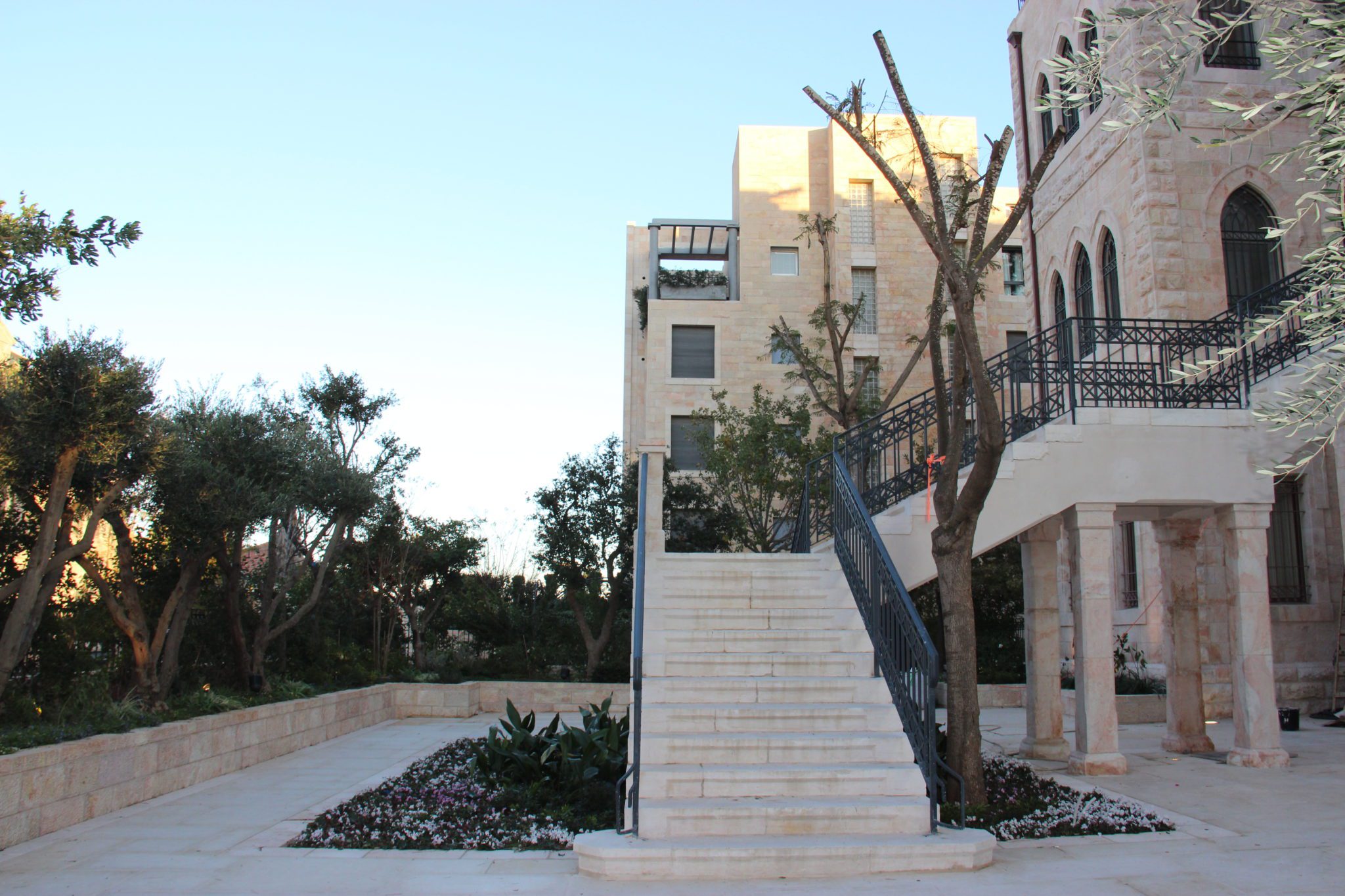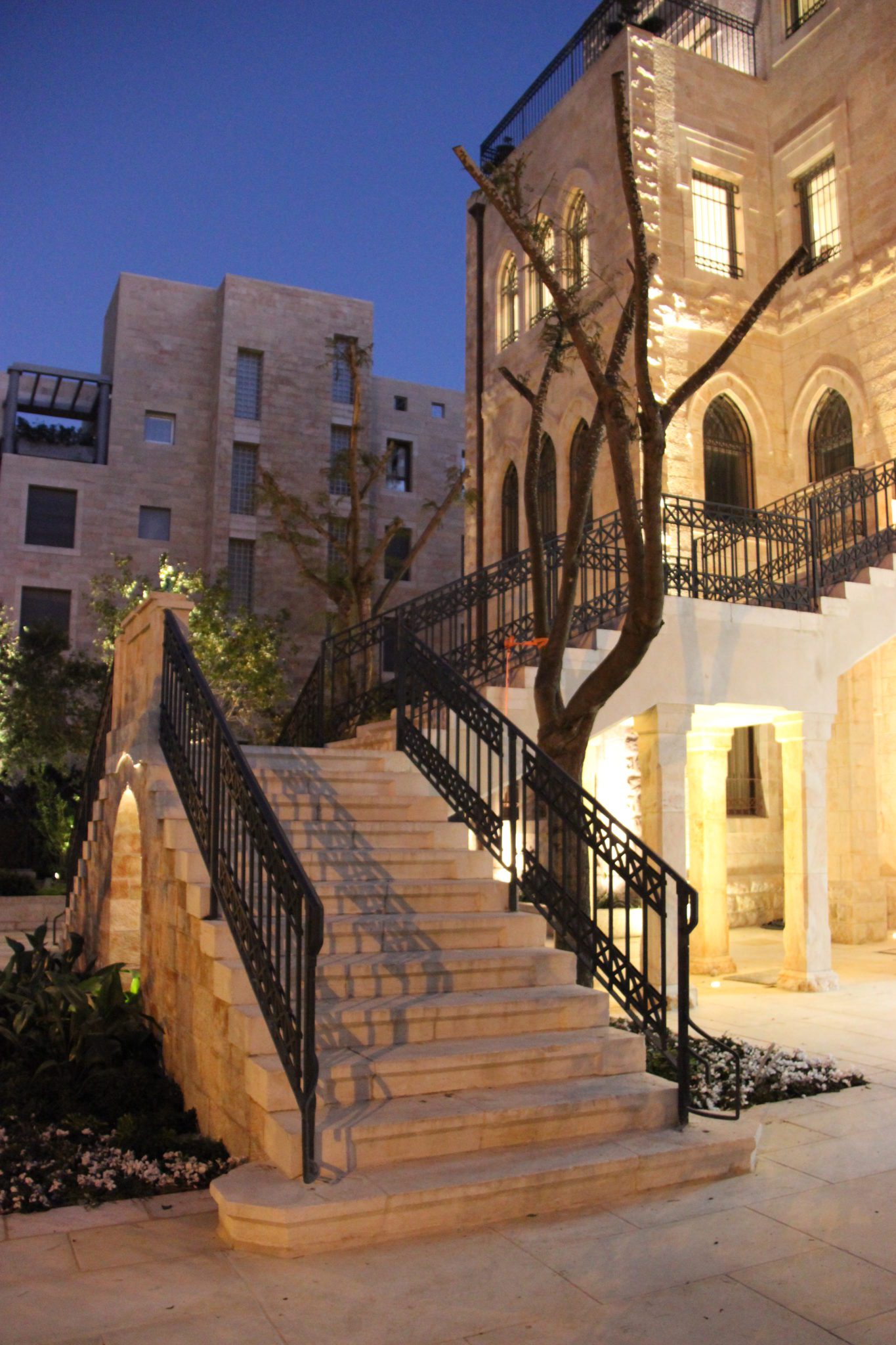 Complex addition of two stories structure on a preservation building that integrates the exterior Jerusalem stone and modern interior.