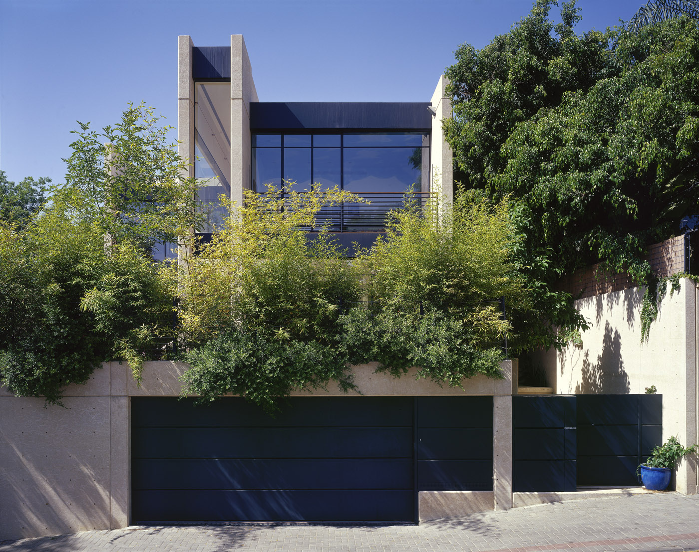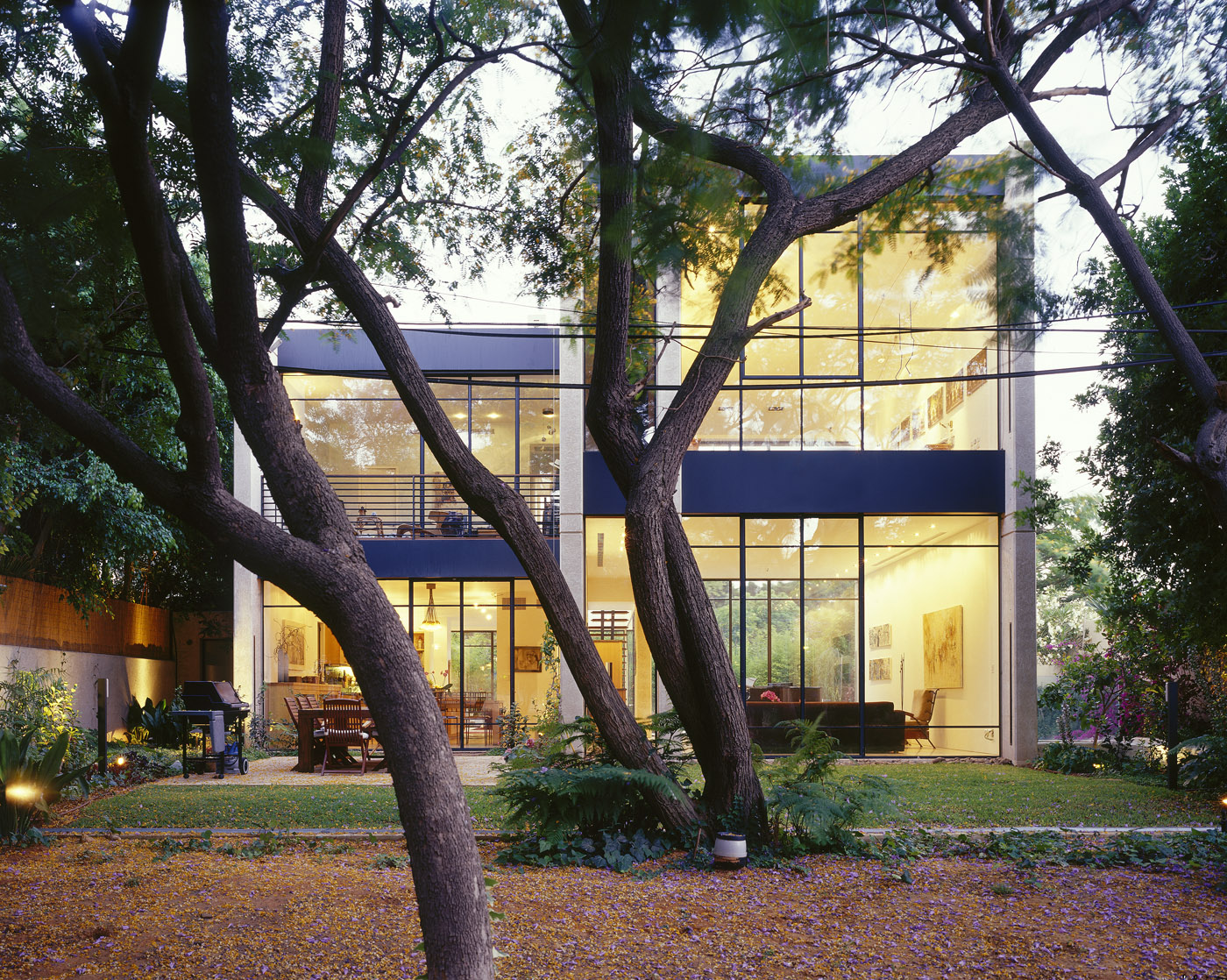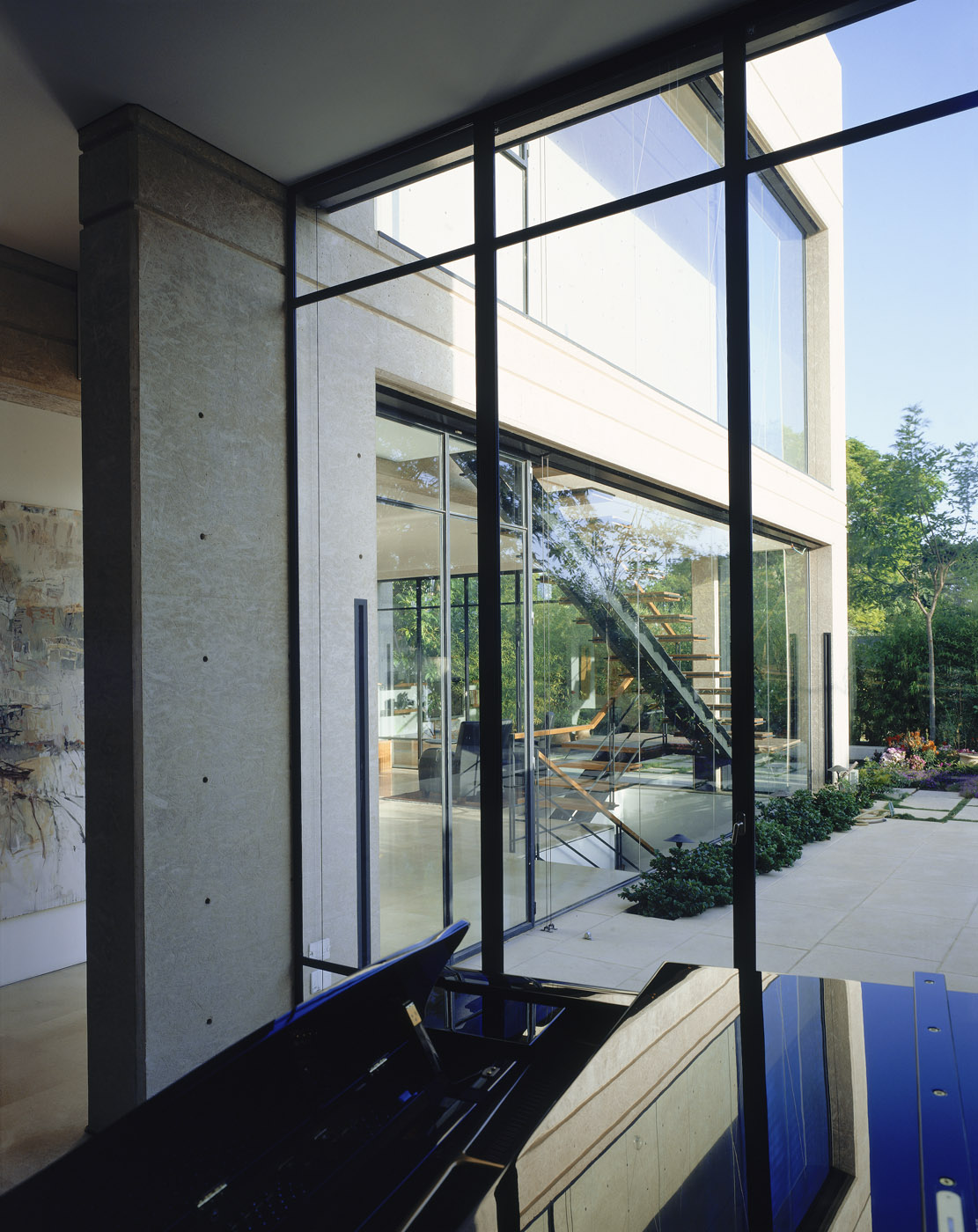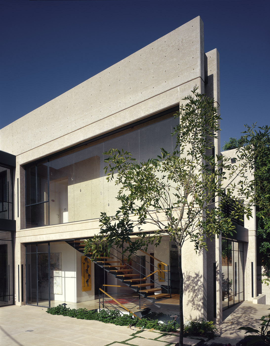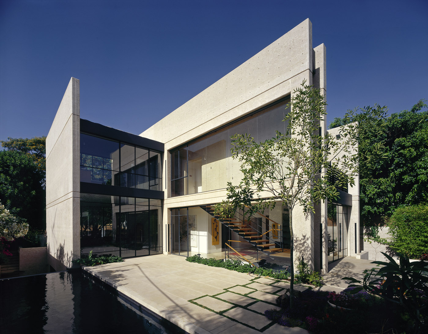 House within a combine lots that includes complex stone work with exposed white concrete.