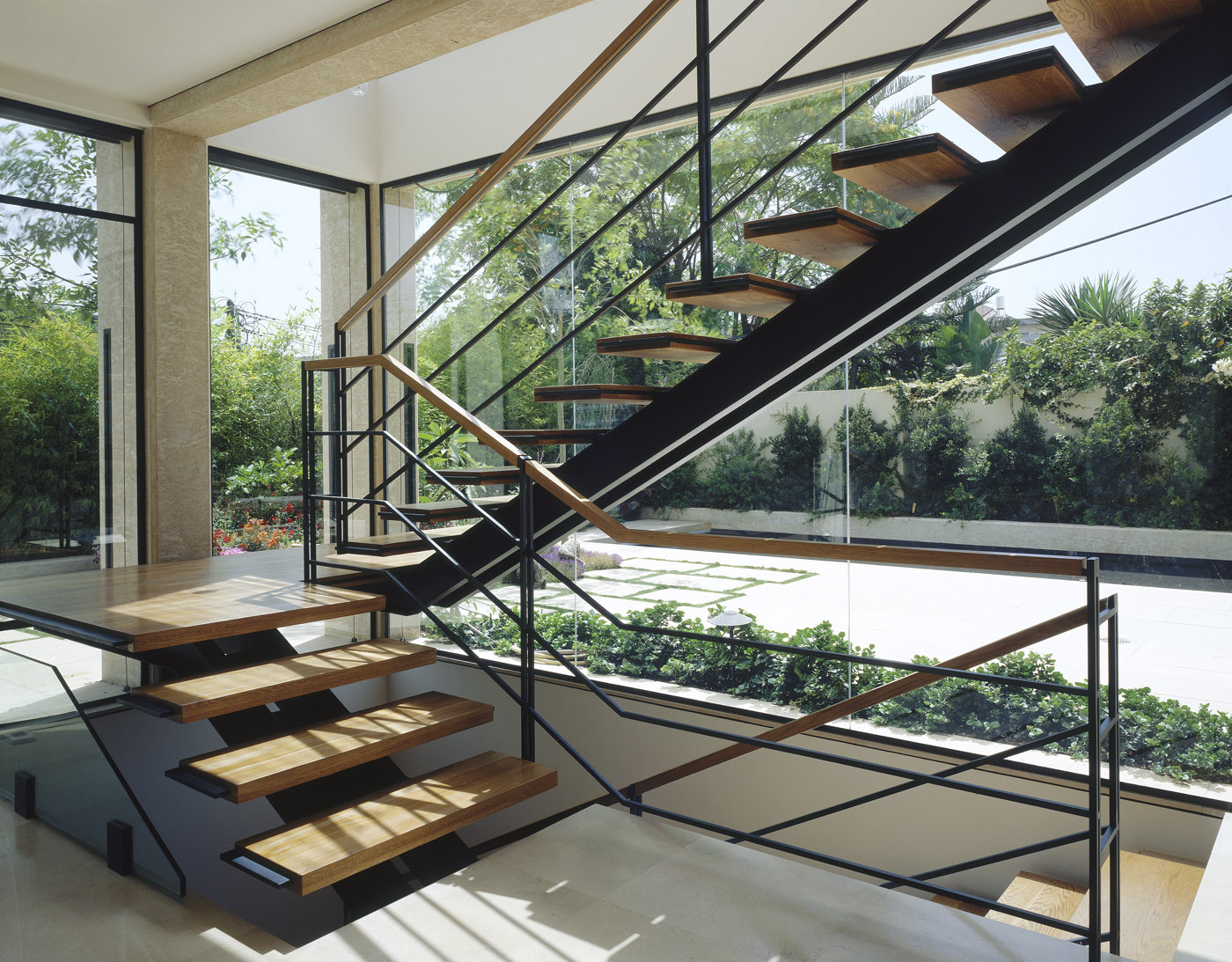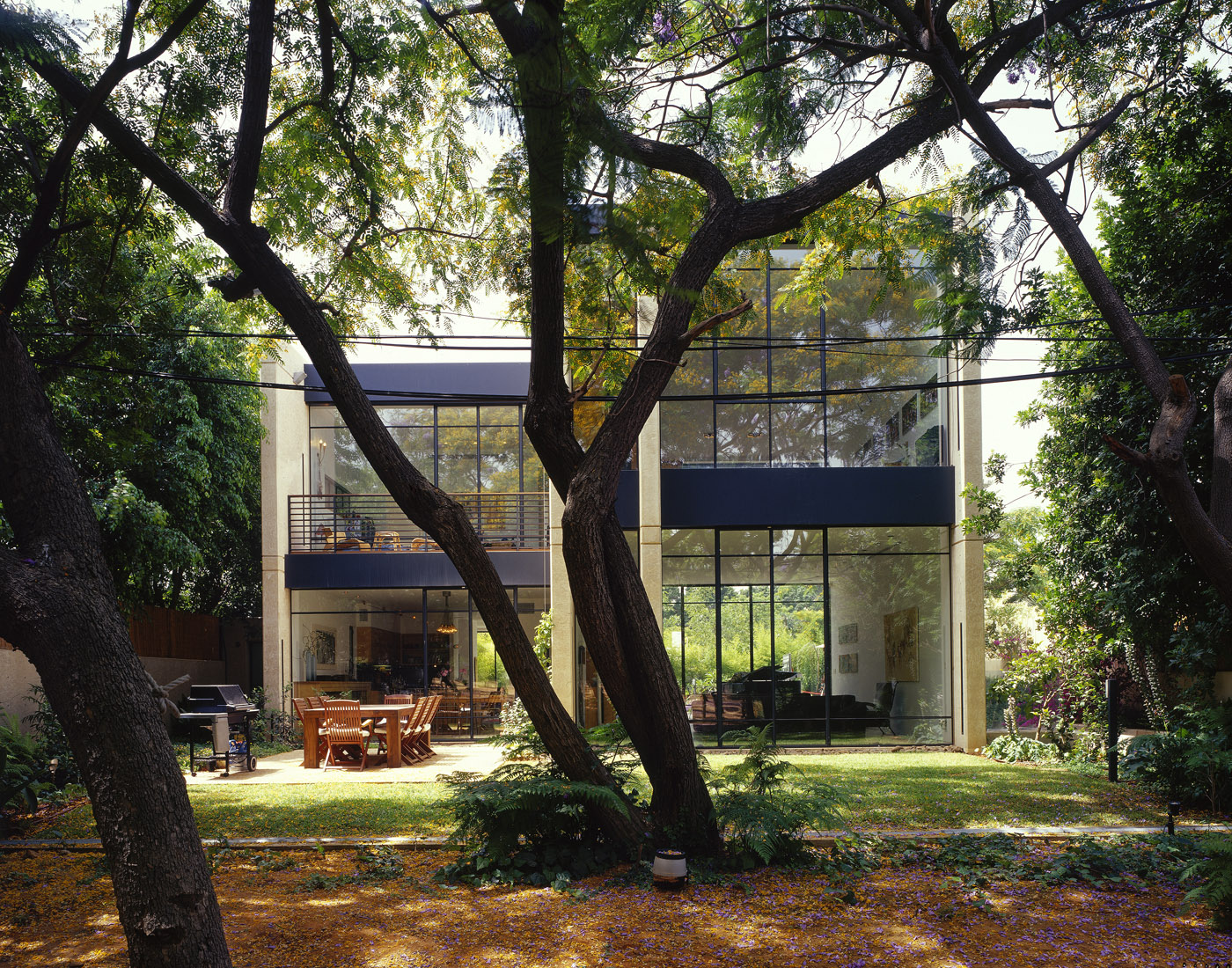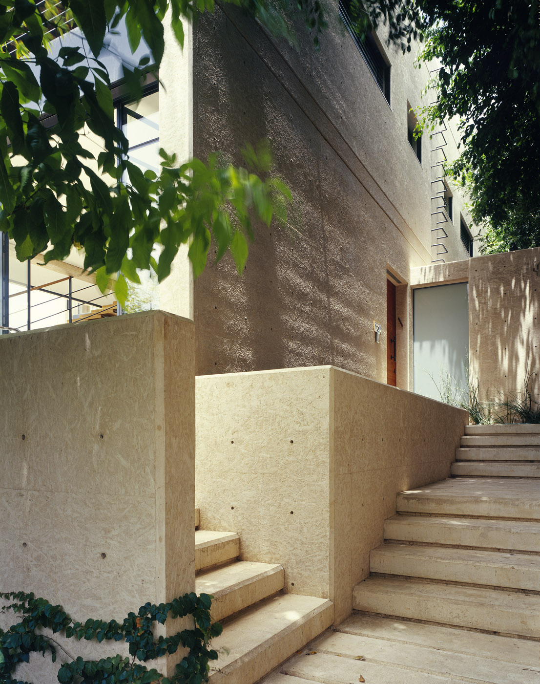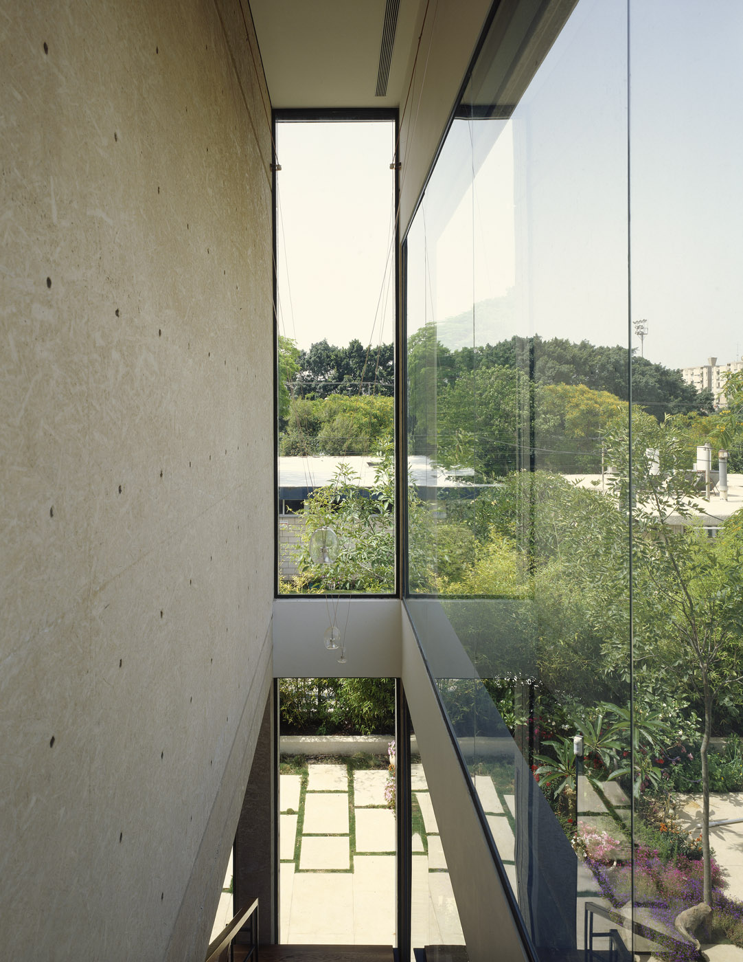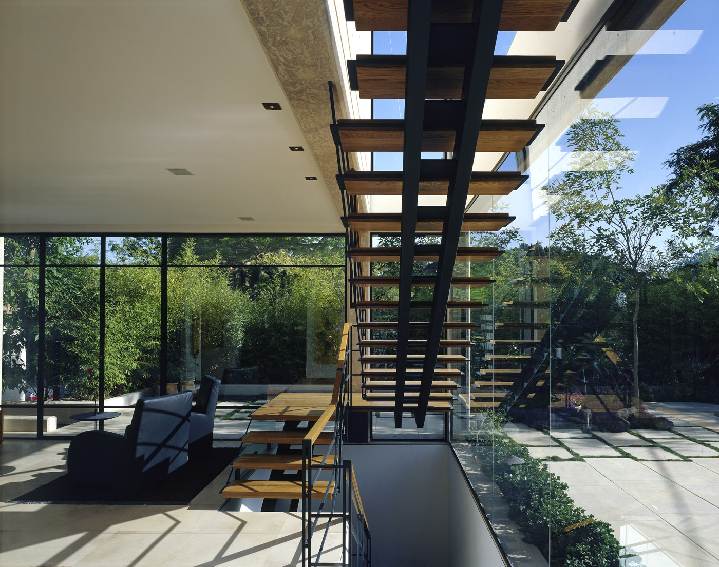 House within a combine lots that includes complex stone work with exposed white concrete.
