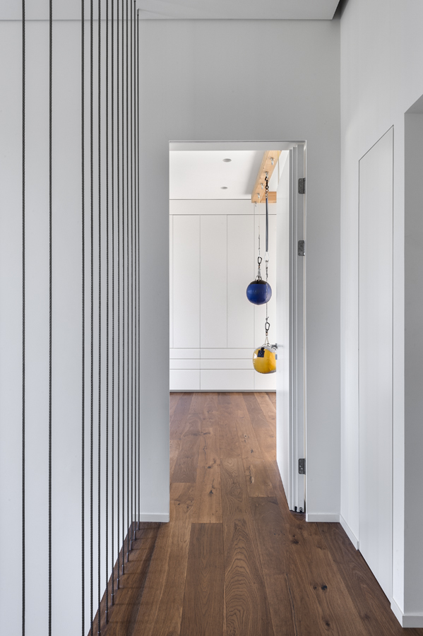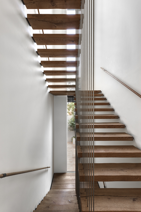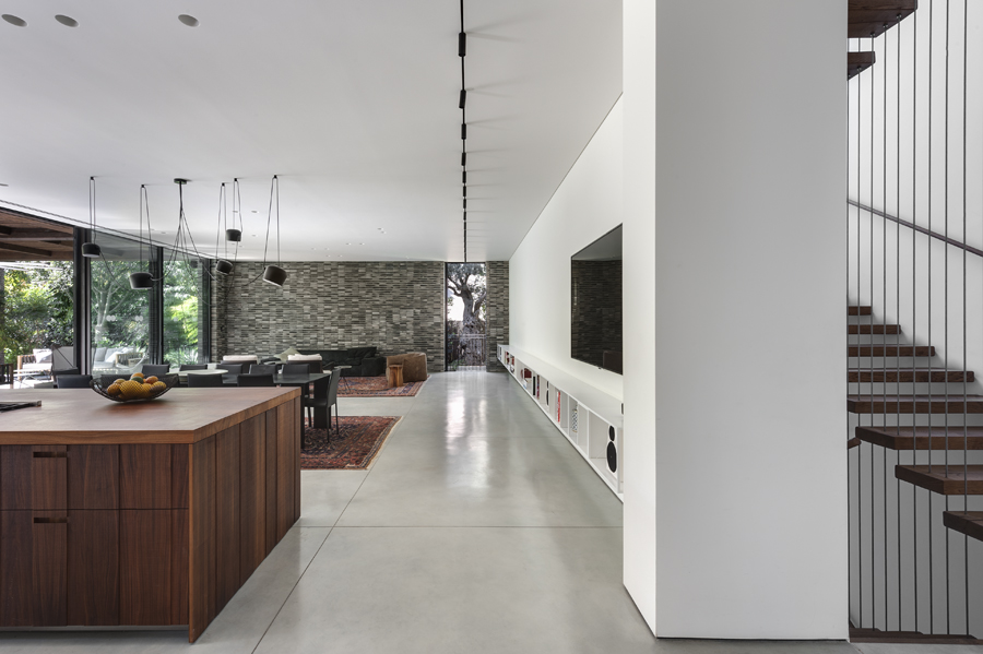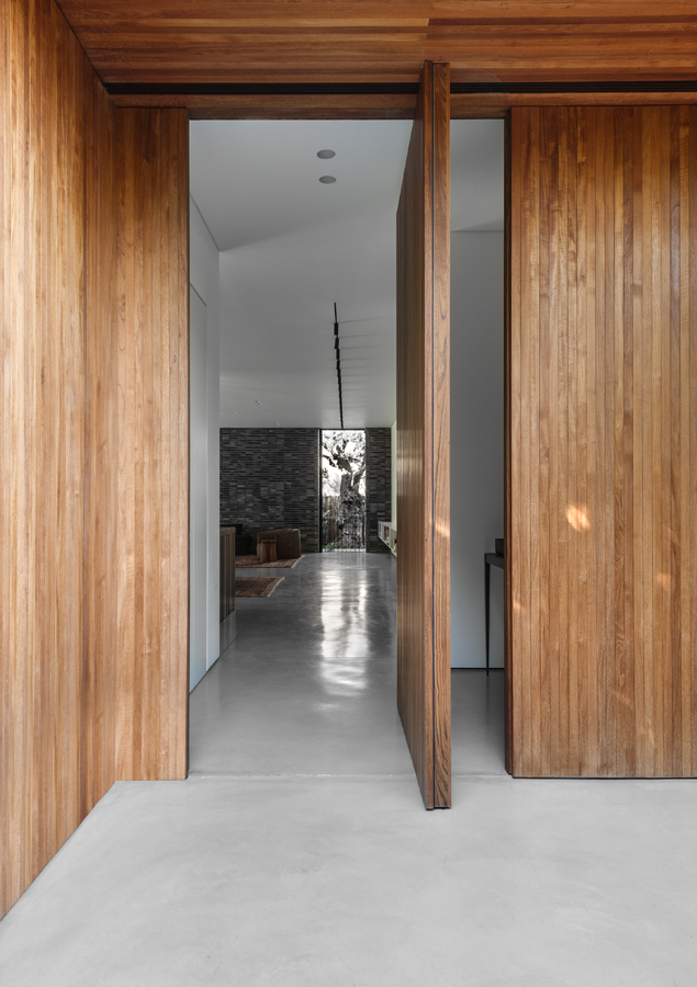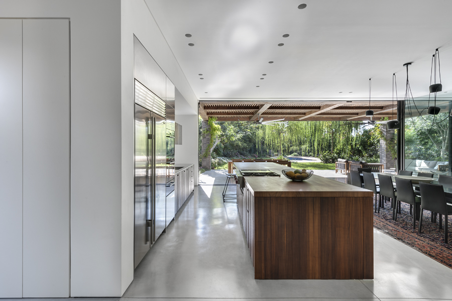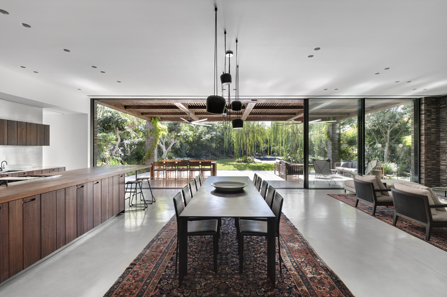 בית עם פתחים רחבים מאוד המכניסים פנימה את הנוף, כולל קורות עץ מיוחדות בעלות מוטת רוחב רחבה מאוד.