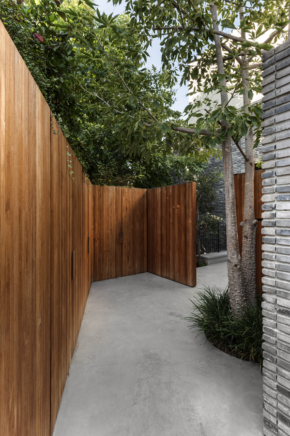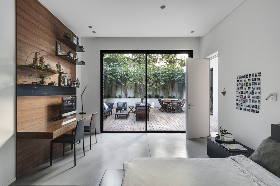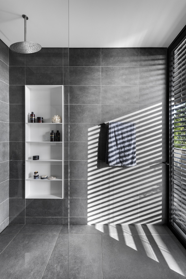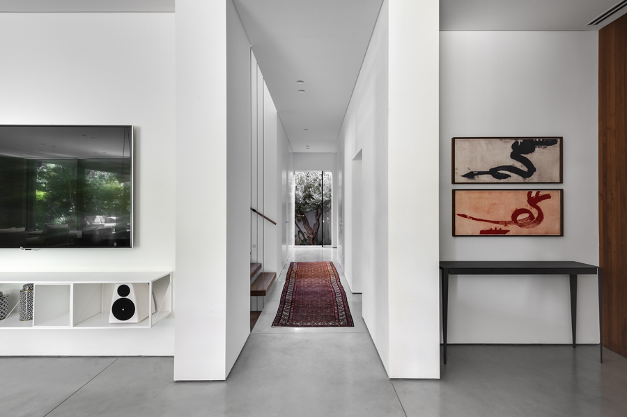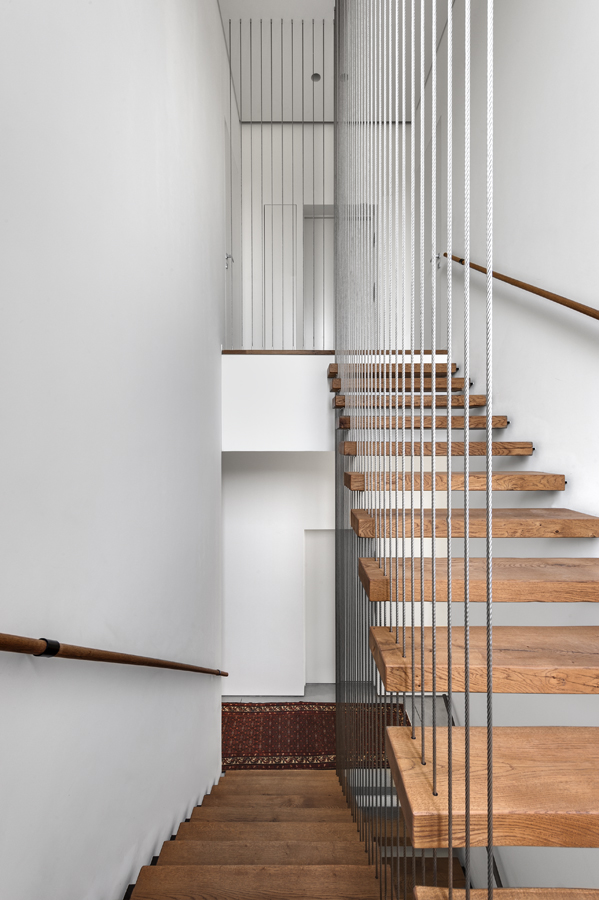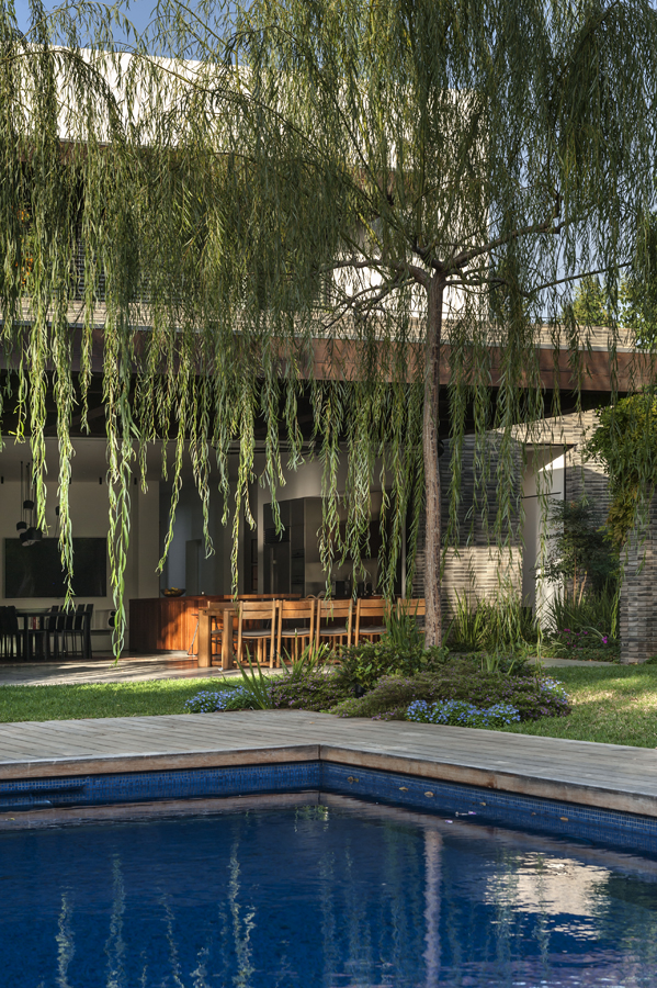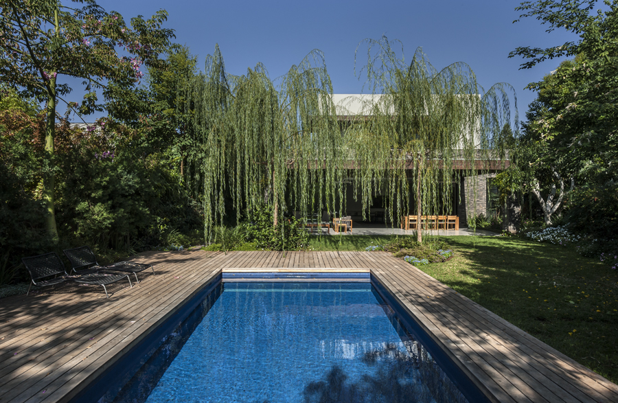 בית עם פתחים רחבים מאוד המכניסים פנימה את הנוף, כולל קורות עץ מיוחדות בעלות מוטת רוחב רחבה מאוד.
